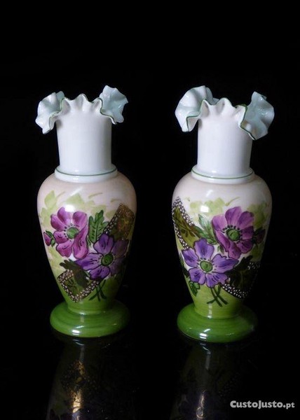Par de jarras vidro opalino pintadas, decoração, " Flores ".