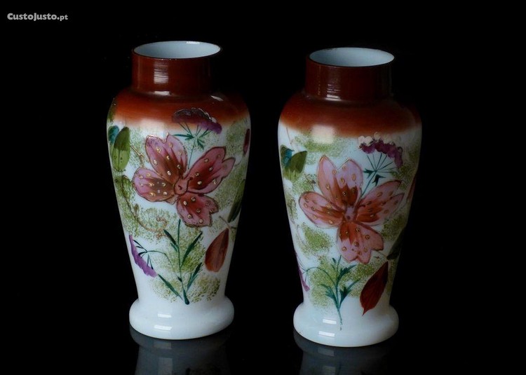 Par de jarras vidro opalino, decoração policromada "Flores".