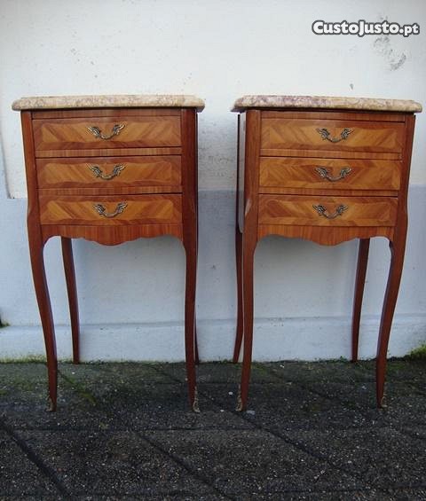 PAR DE MESAS DE CABECEIRA Estilo Luis XVI, em mogno e raiz de mogno. Três gavetas, aplicação de metais, tampo em mármore.