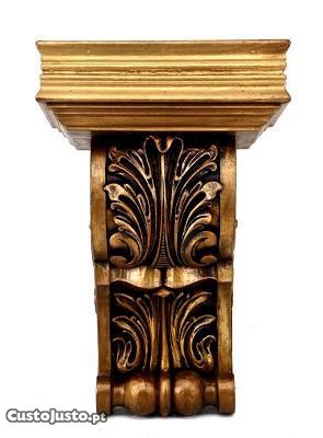 Peanha dourada antiga em madeira entalhada e relevada, com decoração vegetalista.