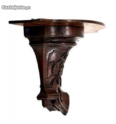 Peanha em pau-santo e mogno - corpo em pau-santo com decoração entalhada e relevada com motivos vegetalistas, tampo recortado em madeira de mogno.