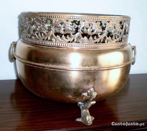 Vaso em cobre com pés em forma de peixe mede 27 cm de diâmetro x 24 cm altura