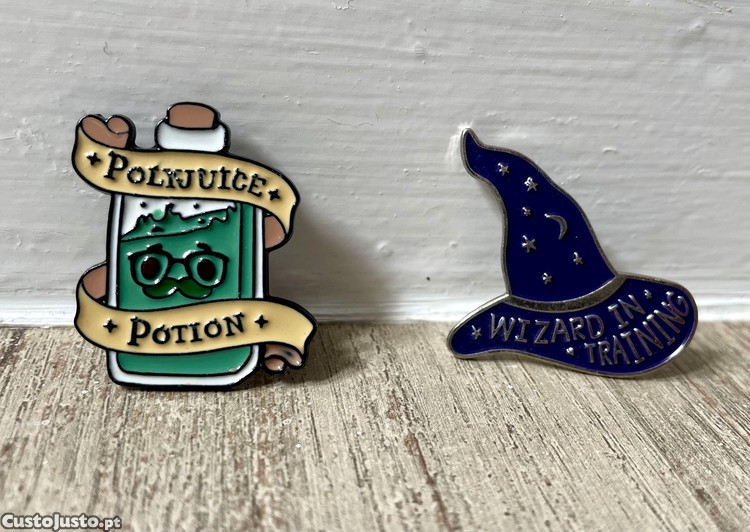 Ambos de metal, de formato diferente. Com tema de magia. Um tem bordas pretas, com formato de frasco com líquido verde, uma cara com óculos e bigode e um papiro com indicação de "Polyjuice Potion". O outro tem bordas prateadas e formato de chapéu de bruxo ou mago, de cor azul escura, decorado com fita, estrelas e lua em prateado brilhante, com indicação de "Wizard in Training" também em prateado.