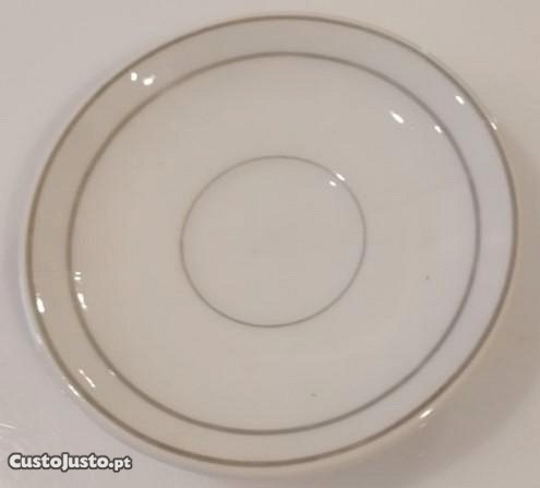Pires de chávena de café em porcelana Vista Alegre 1947/68, branco, com filetes cinzentos, em muito bom estado.