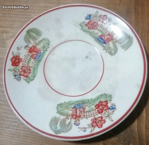 Pires de chávena de chá em faiança "Massarelos - Lusitânia", de inícios do século XX, motivo floral chinês policromado, com o diâmetro de 15cm.