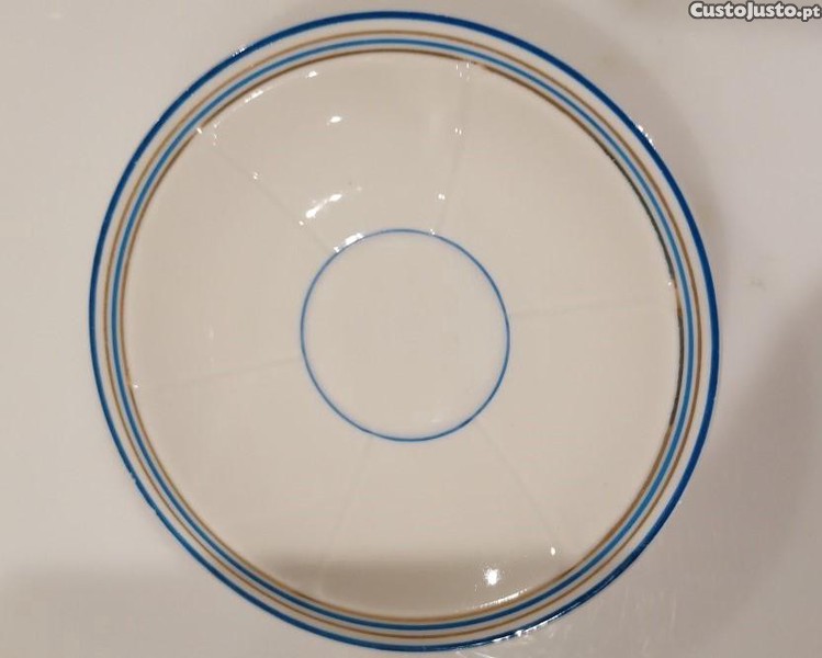 Pires de chávena de café em porcelana da Sociedade de Porcelanas Coimbra, carimbo redondo, com cinco filetes azul e dourado.