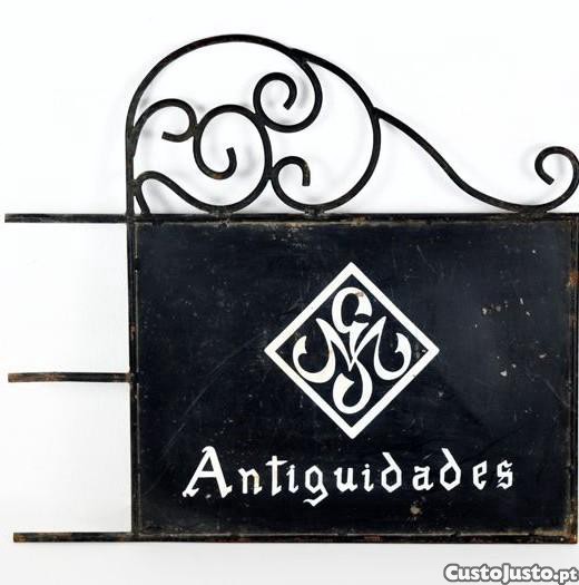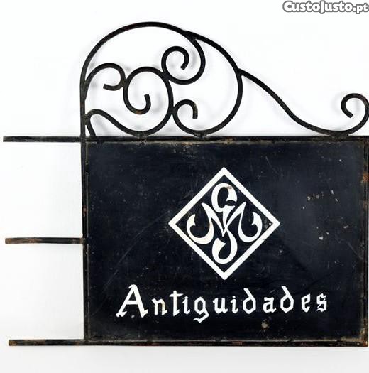 Placa vintage de exterior de loja em ferro pintada de preto e branco "Antiguidades".