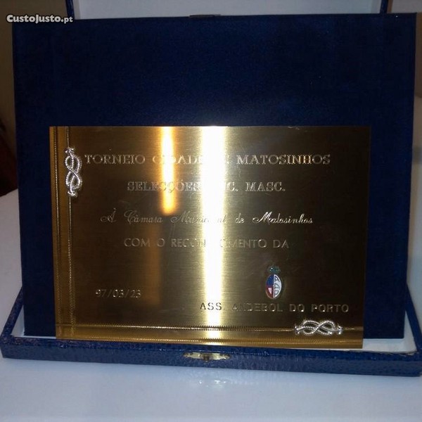 Placa em metal dourado, com estojo e suporte porta fotografias, relativa ao Torneio Cidade de Matosinhos, Seleções Iniciados Masculinos, de 23/03/1997, com o reconhecimento da associação de Andebol do Porto.