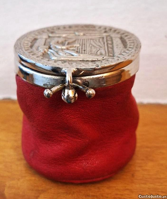 Porta moedas antigo Arte Nova em prata (?) e couro vermelho, com decoração de mulher em relevo na tampa, dobrável, com a altura de 5,5cm e o diâmetro de 5cm.