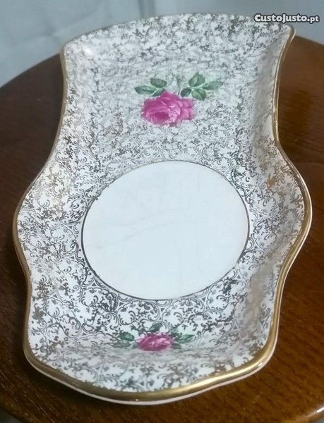 Prato de chávena almoçadeira em porcelana Estatuária, decoração Athenea policromada floral e filete a ouro, com o comprimento de 25,8cm.