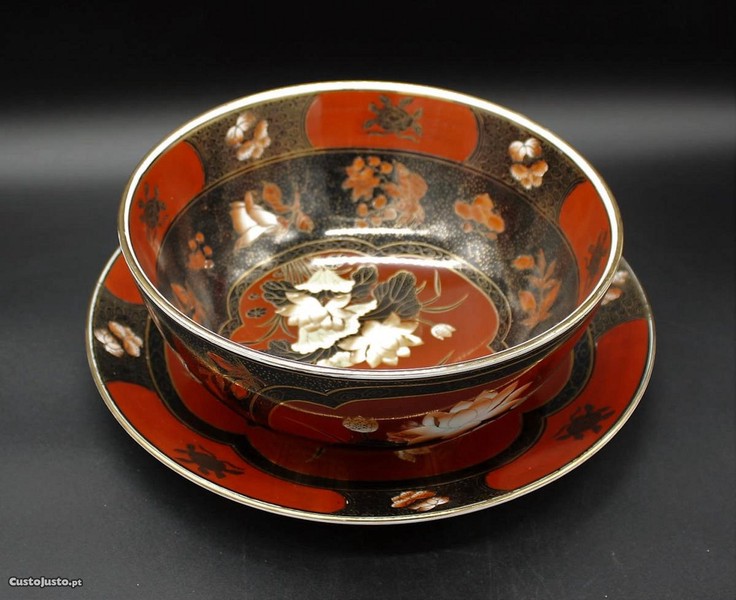 Prato e bacia em porcelana de Macau, marcado na base. Decoração floral e geométrica.
