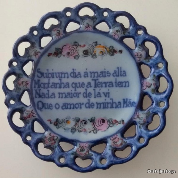 Prato em faiança "Pedros - Alcobaça", motivo 100, vazado e gomado, com quadra: «Subi um dia à mais alta / Montanha que a Terra tem / Nada maior de lá vi / Que o amor de minha Mãe .