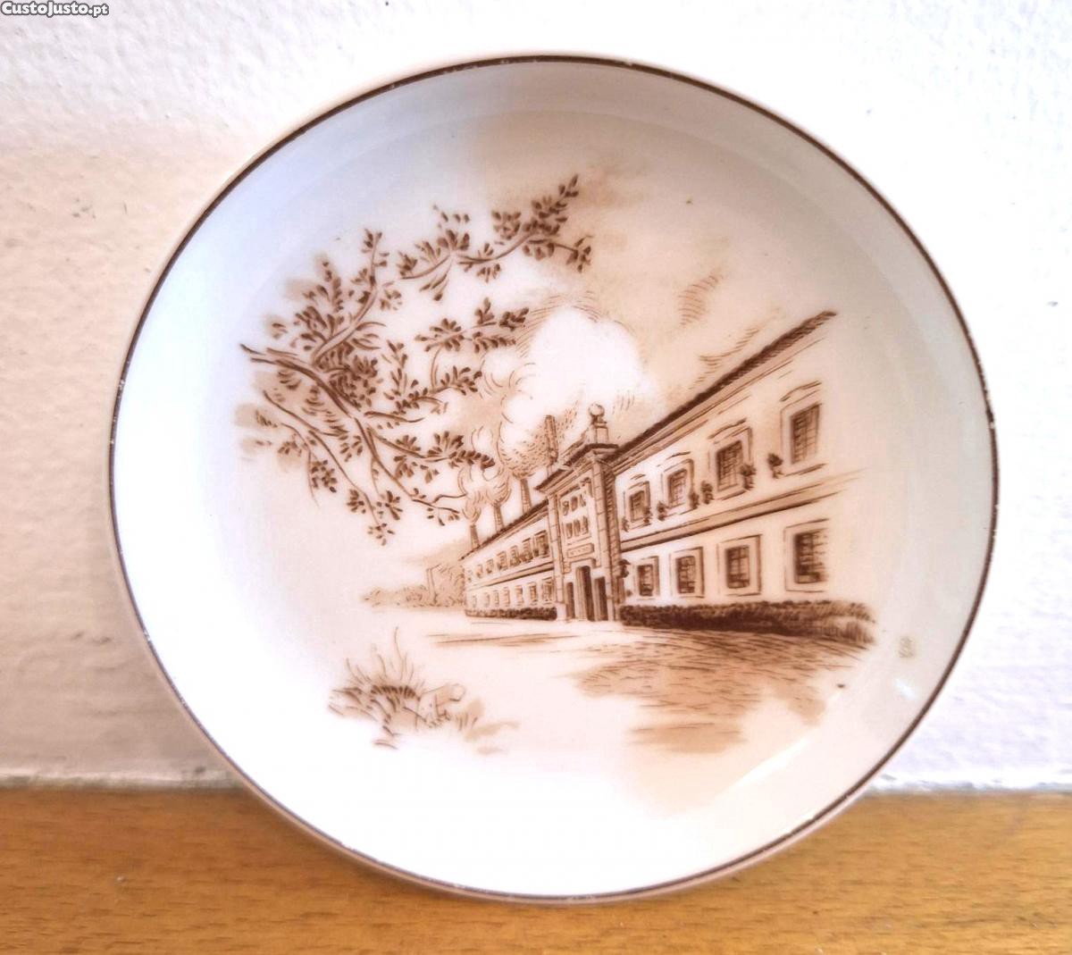 Prato em porcelana Vista Alegre 1947/64, motivo Fábrica, castanho, raro, em bom estado, com o diâmetro de 9,3cm.