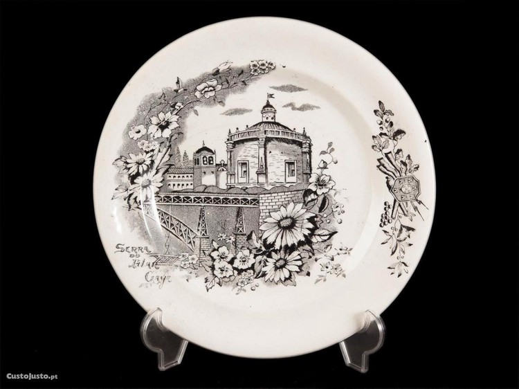 Prato ladeiro em faiança portuguesa moldada, relevada e pintada da fábrica J. P. Valente / Devesas - Vila Nova de Gaia, trabalho do 1 quartel séc. XX. Decoração ao centro e em primeiro plano da vista superior da Ponte D. Luiz e em segundo plano o Mosteiro da Serra do Pilar, ladeado por motivos de arranjos florais e enrolamentos vegetalistas com inscrição no lateral esquerdo "Serra do Pilar - Gaya", monumento histórico da cidade de Vila Nova de Gaia. Marca por carimbo na base Valente - Fábrica de Louças das Devesas - Porto.
