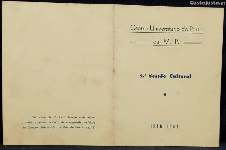 Programa/Convite do Centro Universitário do Porto da M. P., em bom estado estado, conforme fotos, leves marcas do tempo/manuseio.