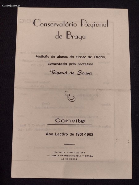 Programa/Convite 1961/62 Conservatório Regional de Braga