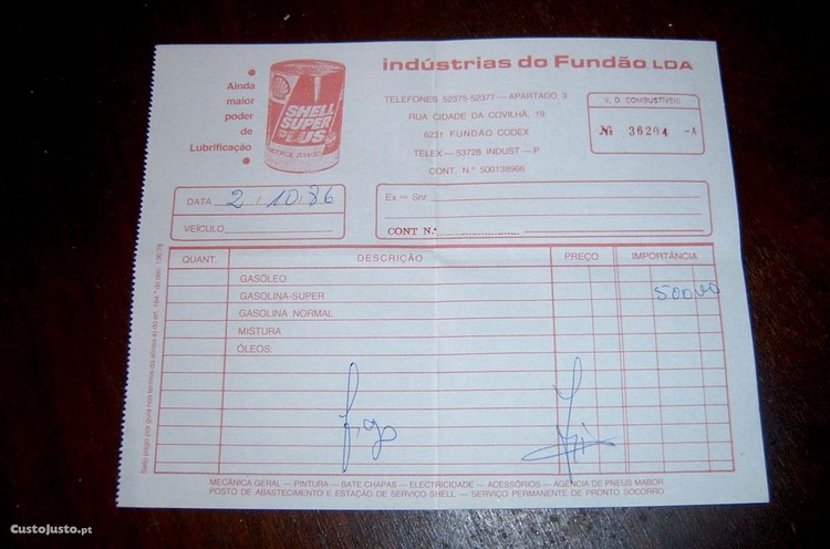 1 factura de 1986 das Industrias do Fundão Lda, com imagem de publicidade Shell Super Plus