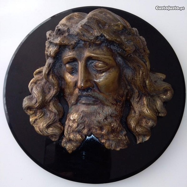 Quadro redondo em vidro preto (bronze), com camada refletora, e rosto de Cristo em bronze, aparafusado na parte posterior.