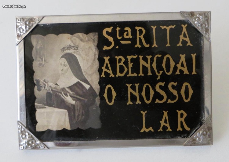 Quadro com foto e mensagem de Santa Rita, com moldura em metal trabalhado nas extremidades.