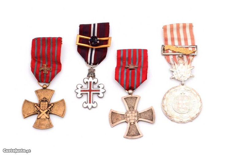 Quatro condecorações em metal branco e dourado com esmaltes.