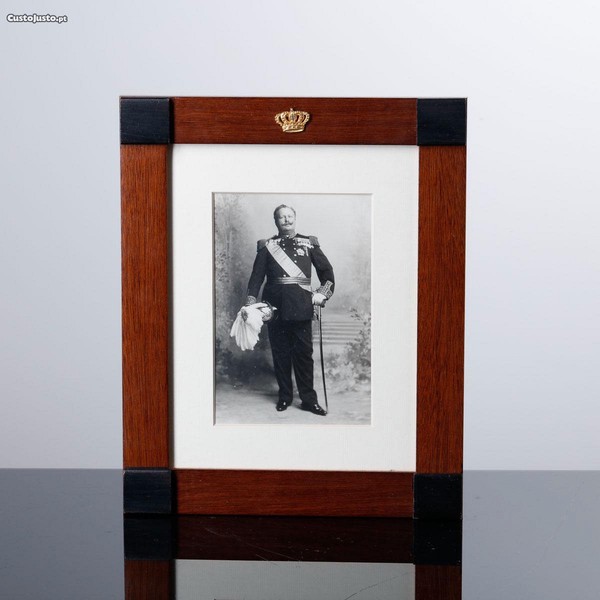 REI D. CARLOS - Fotografia emoldurada. Moldura em madeira exótica e coroa real em metal amarelo.