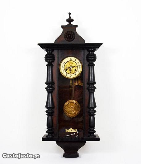 Relógio antigo de Parede Alemão com movimento mecânico de corda manual de chave, caixa em madeira trabalhada, mostrador e pêndulo com motivos de caça.