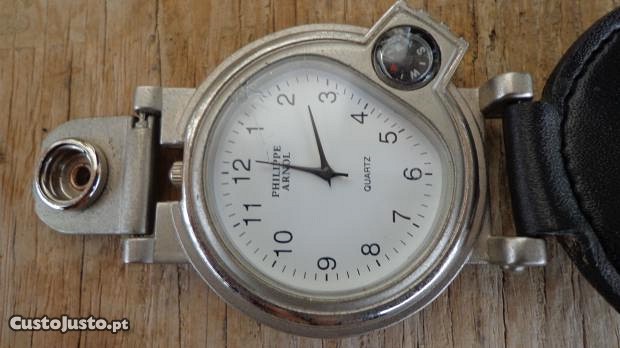 Relógio antigo,PHILIPPE ARNOL, com bússula, Quartz, com capa protectora com aplicação ao cinto, para (viajantes/caçadores/etc.).Tem o vidro frontal estalado, precisa de uma limpeza, pois esteve 30 anos guardado, com os sinais de Uso. Funciona muito Bem.OBS: Para coleccionadores, apreciadores e utilizadores.P.acrescidos