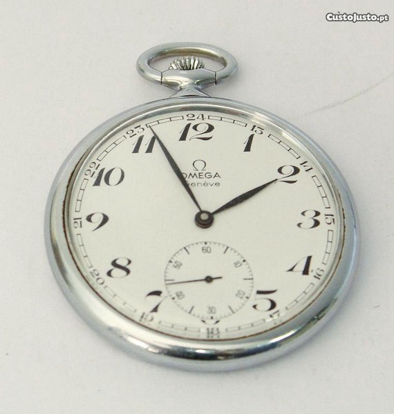 Relógio de bolso antigo da marca Omega, Genève, swiss made, anos 20?, com caixa em aço, com mostrador em porcelana branca, numeração árabe e ponteiros pretos, movimento de corda, a trabalhar.