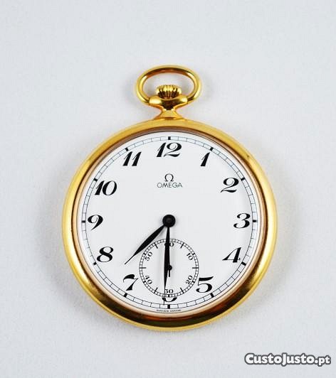 Relógio de bolso Omega com movimento mecânico de corda manual. Suíço 17 Jewels, mostrador com numeração árabe e ponteiro dos segundos às 6h. Caixa Plaqueada a Ouro. A funcionar regularmente e em bom estado de conservação.