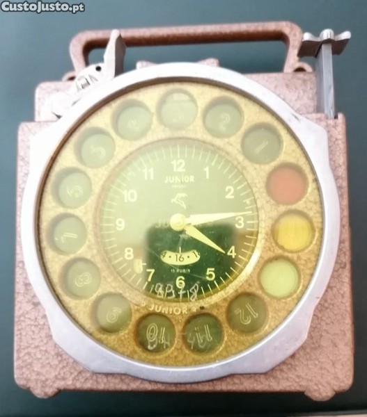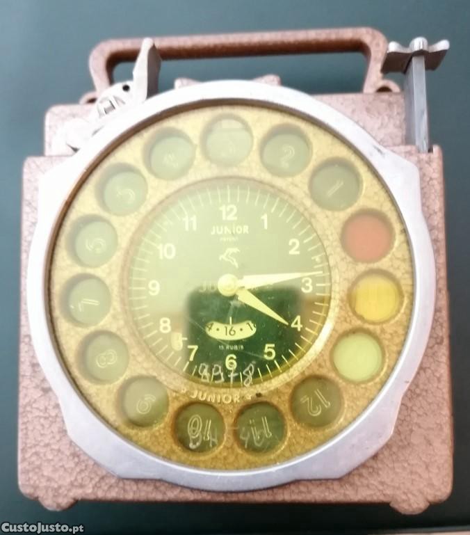 Relógio de constatação de pombos de competição, usado na columbofilia, para registo das anilhas na chegada dos pombos em concurso, a funcionar, da marca holandesa Junior Patent, de 15 rubis, anterior a 1978.