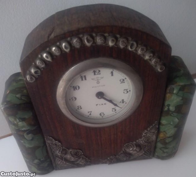 Relógio de mesa antigo, da marca Mauthe, de princípios do século XX, em madeira com partes laterais em baquelite, entalhado com aplicações em prata (com uma pequena falha), mostrador com numeração árabe e mecanismo de corda, a funcionar.