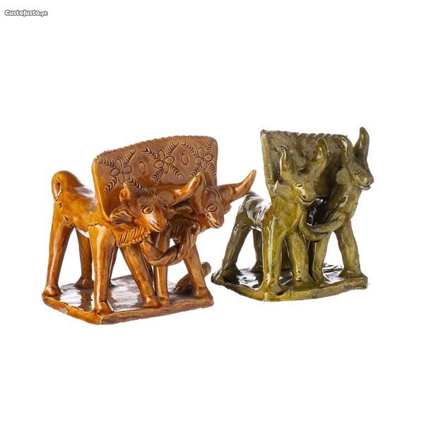 Esculturas em barro de Barcelos, vidrado em tons verde e amarelo.
