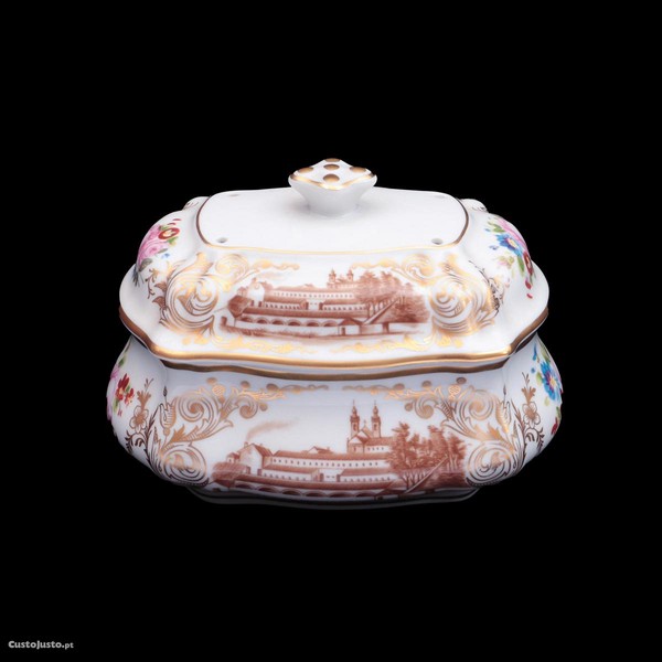 Saboneteira em porcelana da Fábrica da Vista Alegre. Decoração a sépia e dourado "Vistas da Fábrica", com certificado de autenticidade. Marca n 36 (1980-1992), edição exclusiva do Clube de Coleccionadores para o ano de 1992, exemplar n 0296/2500.