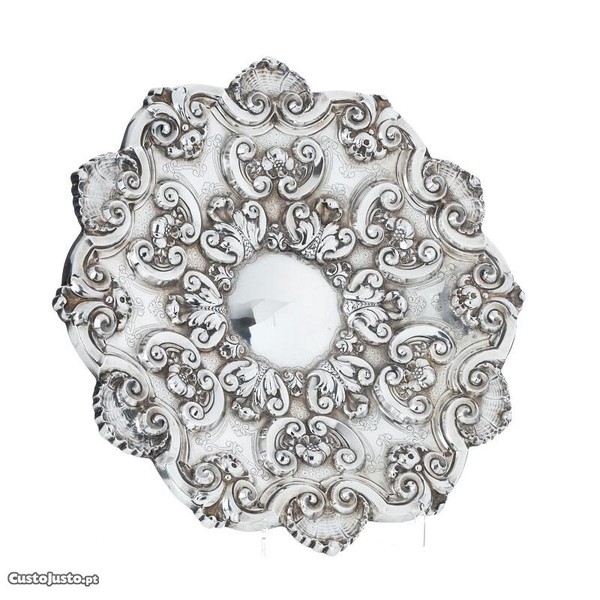 SALVA DE SUSPENSÃO EM PRATA D. JOÃO VSalva antiga de suspensão em prata portuguesa, contraste Águia, recortada e releva com volutas, concheados e flores, estilo D. João V.Dimâmetro: 45 cm.Favor de ver as oito imagens.