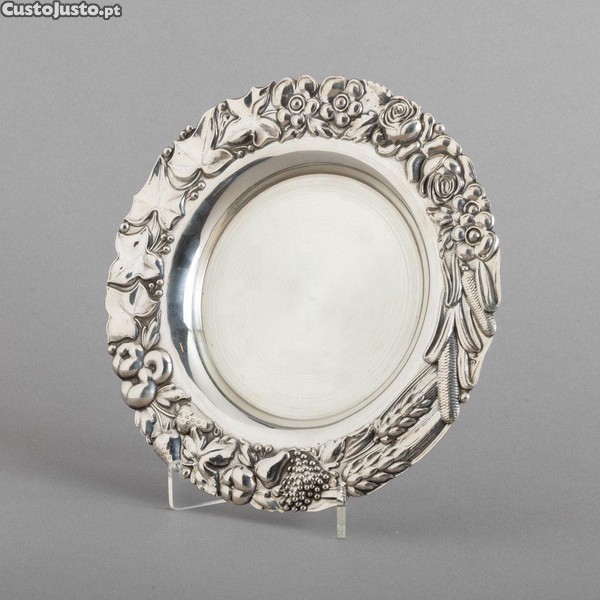 Salva recortada em prata portuguesa, marcada e contrastada com decoração relevada e elementos vegetalistas.