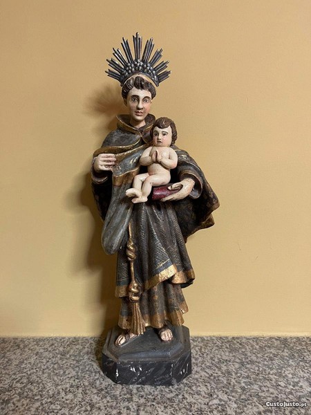 Santo António antigo em madeira, policromado. Acompanha resplendor antigo em prata.