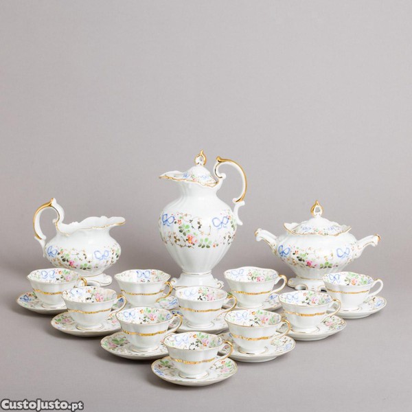 Serviço de café da Vista Alegre em porcelana moldada com decoração policromada e dourada "lacinhos". Composto por cafeteira, leiteira, açucareiro e dez chávenas com pires.