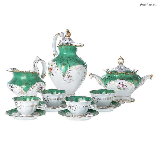 Serviço de café em porcelana da Vista Alegre, decoração a verde, dourado e motivos florais policromados, composto por: bule, leiteira, açucareiro e 6 chávenas de café com pires. Marca em uso N.29 em uso (1922-1947).