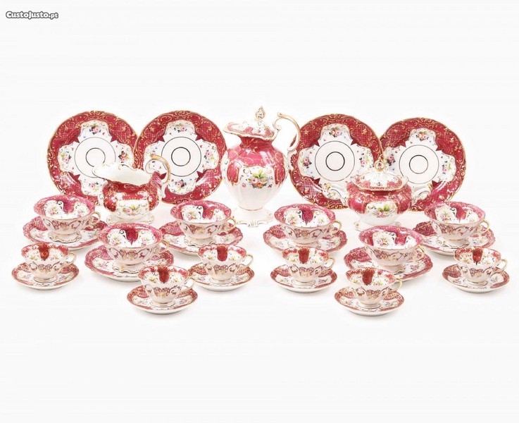 Composto por cafeteira, açucareiro, leiteira, 6 chávenas de café com pires, 6 chávenas de chá com pires e 4 pratos pequenos.
