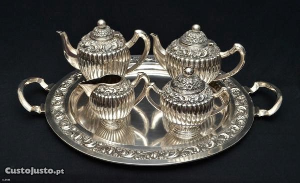 Conjunto de serviço de chá e café em prata portuguesa, com respetivo tabuleiro. Origem Portugal, século XIX.