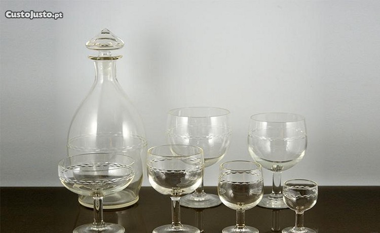 Serviço de Copos em Vidro com decoração de filete geométrico em baixo relevo composto por Garrafa, 6 Copos de Água, 6 de Vinho Branco, 6 de Vinho Tinto, 4 Taças, 5 Cálices e 6 de Licor.