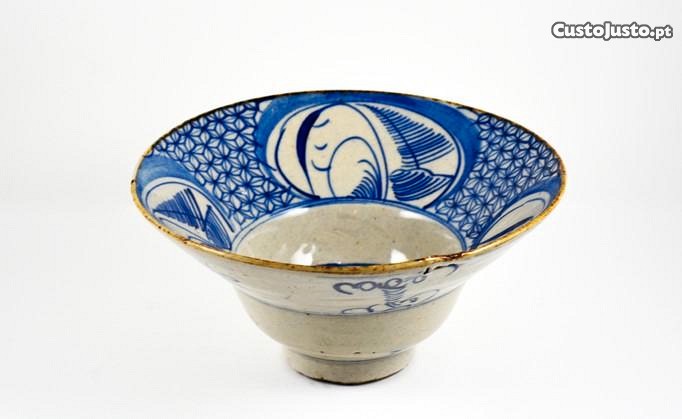 Taça de pé possivelmente do séc. XVII em porcelana da China Companhia das Índias "Provincial". Dinastia Ming, com decoração a azul e reservas no tardoz.
