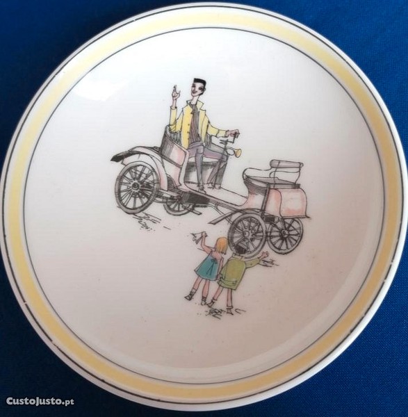 Taça em porcelana Vista Alegre 1947/68, com decoração policromada de carro antigo com condutor e casal de jovens a acenar na passagem.