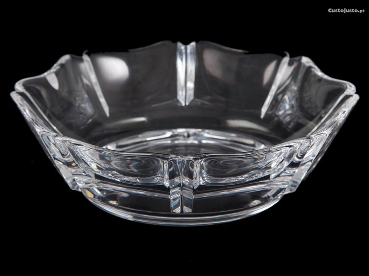 Em cristal translucido moldado, recortado e lapidado, fabrico da Orrefors, trabalho sueco do séc. XX. Corpo liso de formato circular e de covo acentuado, decorado por caneladuras verticais largas de topo recortado, intercaladas por faixas verticais lapidadas. Inscrições incisas na base.