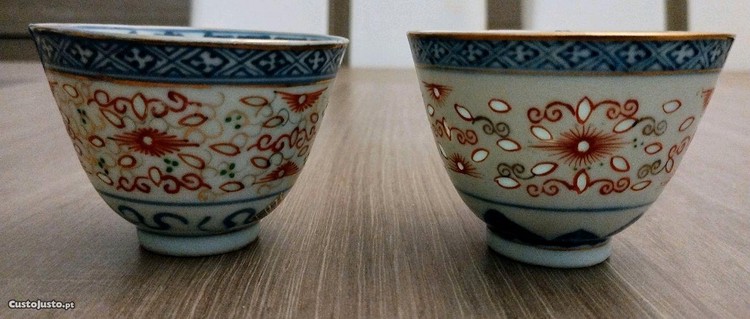 Taças de chá Chinesas com transparências. Altura: 5cm; Diâmetro: 7cm. Uma das taças contém uma pequena lasca. Portes a cargo do comprador.