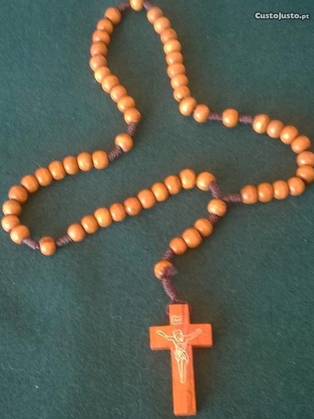 Terço com pedras redondas em madeira, e cruz com imagem de Cristo numa face e gravação no verso com palavra Bethlehem.