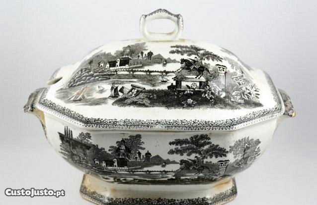 Terrina do séc. XIX em faiança da Real Fábrica de Sacavém com motivo estátua a preto. Marcada na base.