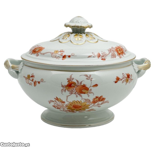 Terrina em porcelana da Vista Alegre. Decoração "Iris" com pormenores a dourado.