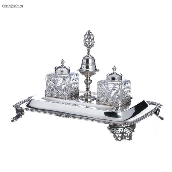 Tinteiro em prata portuguesa, contraste javali (1887-1937), decoração vegetalistas incisa e relevada, pés vazados tinteiros em vidro gormado.