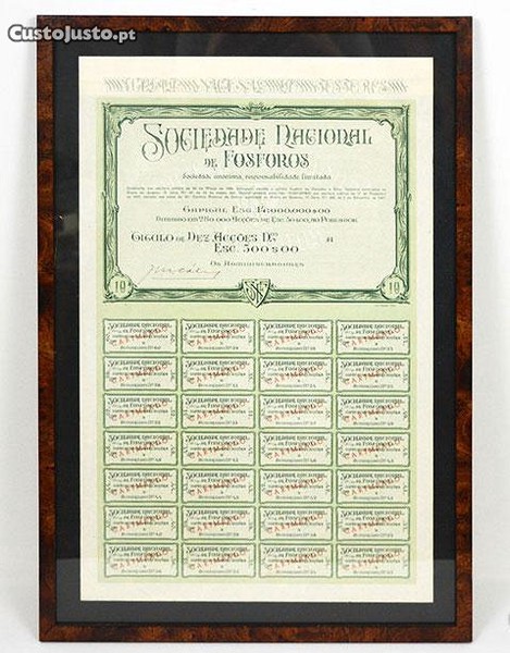 Título de Dez Acções da Sociedade Nacional de Fósforos, Soc. Anónima.